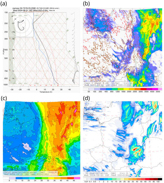 Distribution of selected meteorological parameters from the ALARO model run initialized at 00 UTC on 21 August 2024: (a) Forecast thermodynamic diagram for Zamość valid for 18 UTC, illustrating atmospheric instability and vertical moisture structure; (b) Composite field of Convective Available Potential Energy (CAPE) and 0–6 km vertical wind shear (SHEAR), indicating zones of moderate instability and weak-to-moderate shear conducive to multicellular convection; (c) Total Precipitable Water (TPW), showing a deeply saturated troposphere over central Poland with local maxima exceeding 40 mm; (d) Simulated 3 h accumulated precipitation for the 15:00–18:00 UTC interval, highlighting a localized precipitation SE Poland—close to Zamość region. Data source: Institute of Meteorology and Water Management—National Research Institute (IMGW-PIB).
