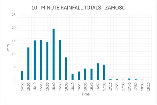 A quasi-stationary convective storm on 21 August 2024 led to one of the most intense rainfall events ever recorded in the Zamość area (Figure 8). Over just one hour, precipitation totaled 88.3 mm, including a maximum 10 min accumulation of 19.5 mm. According to the Chomicz index, this corresponds to α = 12.8, classifying the event as third-degree torrential rainfall (B3) (~117 mm/h, categorized as extreme rainfall by WMO) (Figure 9).