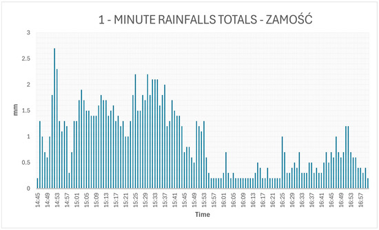 During the most intense phase (from 14:46 UTC to 15:59 UTC), a total of 105.1 mm was recorded within just 73 min (mean rate of ~86 mm/h, within the WMO extreme category). This yields a calculated α index of 12.3 for that specific interval—still qualifying as third-degree extreme rainfall (B3) under the Chomicz classification. The 1 min rainfall profile (Figure 10) reveals several bursts exceeding 2.5 mm/min, which corresponds to instantaneous intensities over 150 mm/h—well above internationally recognized thresholds for extreme precipitation. These values underscore the efficiency and severity of the convective system, particularly in terms of flash flood potential.