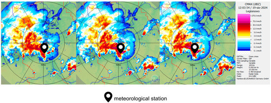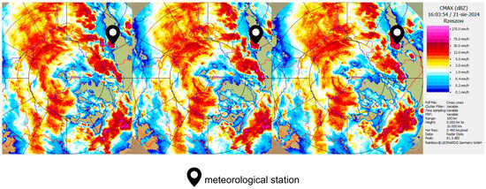 A convective storm affected the Warsaw region in central Poland during the early afternoon of 19 August 2024 (Figure 4). The highest daily precipitation total was recorded at the Pruszków station—located approximately 10 km southwest of central Warsaw—where 81.5 mm of rain was measured. The peak 10 min rainfall intensity was observed at the Warsaw-Okęcie station, reaching 21.3 mm. According to the Chomicz classification, this corresponds to an α index of 9.2, identifying the event as a second-degree torrential rainfall (B2) equivalent to ~128 mm/h, well above the WMO threshold for extreme rainfall).