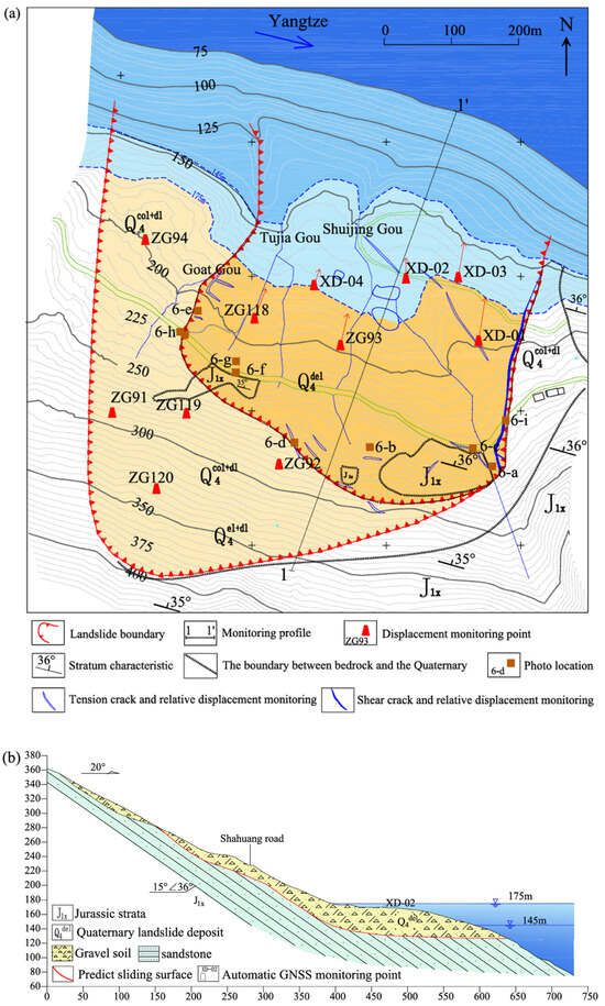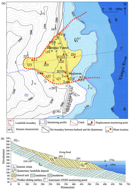 Geological Morphology Map of Baijiabao Landslide: (a) Plan View; (b) profile diagram.