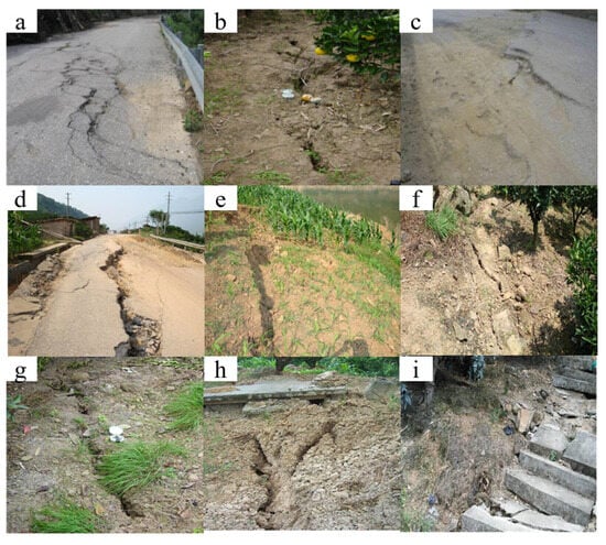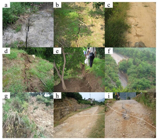Baijiabao landslide deformation area: (a) Road crack along the southern boundary of the landslide in 2007; (b) Tensile crack at the rear edge of the landslide in 2007; (c) Road surface damage in the middle of the landslide in 2008; (d) Tensile crack on the highway at the middle-right section of the landslide in 2009; (e) Bank collapse at the southern front edge of the landslide in 2009; (f) Tensile ground crack at the southern rear edge of the landslide in 2009; (g) Tensile crack on the northern side of the landslide in 2012; (h) Tensile crack on the southern side of the landslide in 2012; (i) Offset and fracture of a small road on the southern middle–rear section of the landslide in 2014.