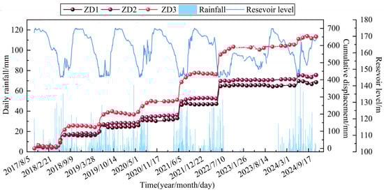 Significant step-like deformations are observed at the monitoring points during the annual reservoir drawdown period. As of 28 December 2024, the cumulative displacements at the front-edge monitoring point ZD1, the central point ZD2, and the rear-edge point ZD3 of the Baijiabao landslide were 385.9 mm, 427.6 mm, and 651.7 mm, respectively (Figure 3). The data indicate that the displacement at the front-edge point (ZD1) is smaller than that at the rear-edge point (ZD3). However, deformation at the front-edge point occurred earlier within the same step-like deformation period, suggesting that movement at the front edge drives subsequent deformation at the rear, consistent with the behavior of a traction-type landslide.