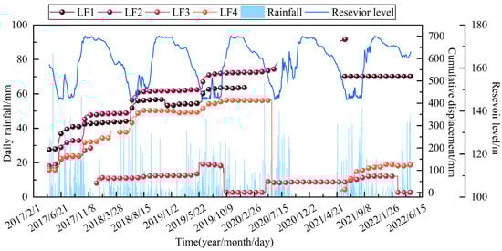 Additionally, four automatic surface crack displacement monitoring instruments were installed on the Baijiabao landslide, with monitoring commencing on 22 April 2017. As shown in Figure 4, the relative displacement monitoring curves of the surface cracks each exhibited a pronounced step-like increase between 2017 and June 2019. Monitoring point LF4 also exhibited a sharp increase in displacement in June 2021. All four cracks are situated along the rear edge of the landslide. The crack widths rank as LF2 > LF1 > LF4 > LF3, with LF3 notably narrower than the others, likely due to its shorter length. LF1 and LF2 are located on the same side and have comparable lengths, thus warranting comparative analysis. At the start of monitoring in April 2017, LF1 had a width of approximately 200 mm, whereas LF2 measured about 110 mm. During the rainfall period in June 2017, all four cracks experienced varying degrees of step-like deformation, with LF1 remaining wider than LF2. Beginning in August 2017, as the reservoir water level in the Three Gorges area gradually rose from 145 m to 160 m by October 2017, the cracks underwent another step-like deformation, during which LF2′s width surpassed LF1, reaching 350 mm. This deformation event was attributed to rainfall.