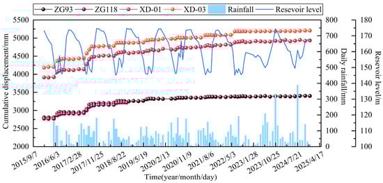 Significant step-like deformations are observed annually at the monitoring points when the reservoir water level decreases to approximately 160 m, coinciding with periods of intense rainfall. As of December 2024, the cumulative displacements at the front-edge monitoring points XD-01 and XD-03 within the Baishuihe landslide warning zone reached 4934 mm and 5206 mm, respectively, whereas the displacements at the rear-edge points ZG93 and ZG118 were approximately 3400 mm (Figure 7). Monitoring point ZG118 was damaged in November 2018; however, prior to this event, its cumulative displacement trend was consistent with that of ZG93, although slightly smaller. The data indicate that the displacements at the front-edge points (XD-01, XD-03) are substantially greater than those at the rear-edge points (ZG93, ZG118). Nevertheless, during the step-like deformation phases, displacement at the rear-edge points occurred earlier than at the front, suggesting that the deformation initiates at the rear and subsequently drives the movement of the front. Given that the front edge is adjacent to the water and more susceptible to sliding, it experiences larger displacements, exhibiting the characteristic features of a translational landslide.
