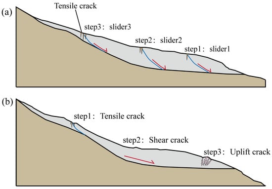 It is noteworthy that the distinct crack development characteristics of traction-type and translational landslides exert different influences on landslide stability; however, current research on this topic remains limited. Typically, traction-type landslides exhibit weaker resistance at the toe, with cracks usually initiating at this location and progressively extending backward. Localized toe collapses result in staged rearward expansion of the landslide mass [26,27,28]. In translational landslides, the middle to rear sections of the sliding surface often exhibit relatively steep inclinations. The downslope driving force generated by the sliding mass in these sections typically exceeds the shear resistance of the corresponding sliding surface. Consequently, a downslope thrust develops in the mid-to-rear slope, creating a tensile stress zone at the rear edge. Deformation generally initiates at the rear of the slope mass [29,30].
