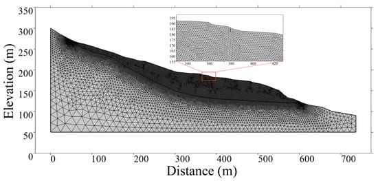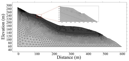 Taking the Baijiabao landslide and Baishuihe landslide as examples, cross-sectional models of the landslides were constructed using AutoCAD 2022 and then imported into COMSOL Multiphysics 6.3 (COMSOL) for mesh generation. As shown in Figure 9 and Figure 10, the Baishuihe landslide is 610 m long and 281 m high, with a tension crack located along the Shahuang Highway at an elevation of approximately 230 m. The Baijiabao landslide is 736 m long and 300 m high, with a tension crack located along the Zixing Highway at an elevation of approximately 185 m. For the sliding body, the maximum mesh element size is set to 2 m with a maximum element growth rate of 1.05, while for the sliding bed, the maximum element size is 40 m with a growth rate of 1.1. The Baishuihe landslide model contains 16,230 mesh elements, and the Baijiabao landslide model contains 22,958 mesh elements.