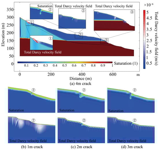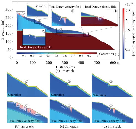 The infiltration field of the Baijiabao landslide at varying depths of crack. (a) Overall and local saturation and Darcy flow field under the 4 m crack condition; (b–d) Saturation and Darcy flow field of region 2 under the 1 m, 2 m, and 3 m crack conditions, respectively.