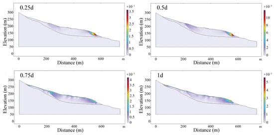 Based on the displacement field results of the Baishuihe landslide under rainfall (Figure 15), the landslide exhibits typical characteristics of translational deformation. At the onset of rainfall, displacement initially occurs in the rear slope region and is accompanied by a coordinated displacement response at the slope toe. As rainfall infiltration continues, the affected displacement area at the rear progressively expands, with secondary sliding bodies developing behind the initial sliding surface, significantly increasing the instability risk at the rear. Additionally, the displacement magnitude at the toe continuously increases as deformation progresses, indicating that the deformation of the Baishuihe landslide gradually propagates from the rear toward the front. This process characterizes a typical rear-driven translational landslide.