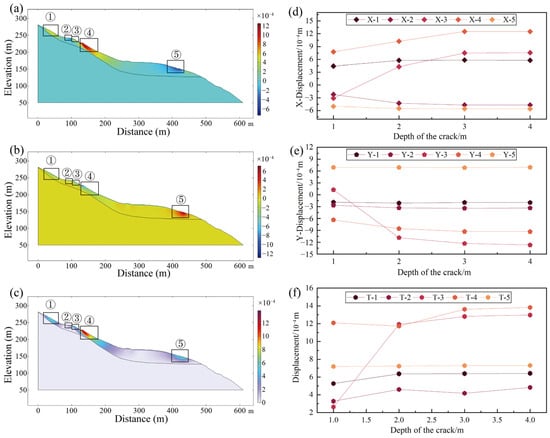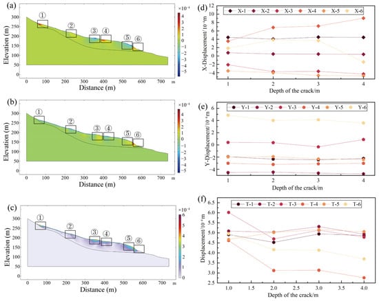 Displacement field of the Baishuihe landslide at varying depths of crack: (a) X-directional displacement field; (b) Y-directional displacement field; (c) Total displacement field; (d) Displacement values in the X direction for different areas at varying crack depths; (e) Displacement values in the Y direction for different areas at varying crack depths; (f) Total displacement values for different areas at varying crack depths.