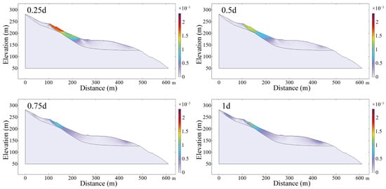 Figure 13 illustrates the displacement field of the Baijiabao landslide under rainfall, which exhibits typical traction-type deformation characteristics: in the early stage of rainfall, displacement is initially concentrated at the landslide front edge, forming a primary sliding zone. As rainfall continues, the affected displacement area progressively expands toward the rear edge, indicating a retrogressive progressive failure pattern. During the deformation, secondary slip surfaces gradually develop in the rear region, eliciting pronounced displacement responses and ultimately producing a hierarchical deformation pattern.