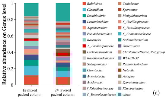 Microbial community composition of the column experiment samples was analyzed based on the MiSeq sequencing results. The microbial community compositions on the genus level in the effluent water and the solid media samples are shown in Figure 9 and Figure 10, respectively. There was a significant difference in the microbial community compositions between the effluent water and the solid media (p < 0.05). During the 40 d column operation, 35 bacterial genera with relative abundances exceeding 1% were identified in the effluent of the two columns. The dominant genera included Pseudomonas (0.37–89.17%), Comamonas (0.00–80.51%), Clostridium (0.06–74.22%), Acinetobacter (0.00–40.37%), Shewanella (0.00–13.70%), o_Enterobacterales (0.00–20.76%), f_Enterobacteriaceae (0.00–15.11%), o_RF39 (0.00–15.40%), and Klebsiella (0.00–16.81%). Most of these genera were bacteria capable of organic matter degradation and driving the nitrogen cycle [27,28,29,30,31]. The inter-group species differences between the two experimental columns were not significant (p > 0.1); however, for each column, the microbial species composition varied significantly with the reaction time (p < 0.05). Following SRB biofilm colonization, the microbial composition in the effluent on 0 d was dominated by Clostridium (74.22%, capable of cellulose degradation under anaerobic conditions) [32,33,34], Acinetobacter (14.75%, degrading complex organics like alkanes and PAHs) [35,36,37], f_Bacillaceae (5.12%, secreting hydrolytic enzymes like amylase, cellulase, protease and lipase for polysaccharide/protein/lipid degradation) [38,39,40], and Lysinibacillus (4.30%, capable of heavy metal reduction and organic degradation) [41,42,43]. During the 0–10 d operation period, the richness and diversity of the microbial community increased (Table S5). The number of dominant genera expanded, most of which had the functions of degrading complex organic matter, denitrification, and iron reduction, including Comamonas, Acinetobacter, Clostridium, Pseudomonas, Shewanella, f_Enterobacteriaceae, o_RF39, Klebsiella, f_Pseudomonadaceae, Ideonella, etc. [28,44,45]. It was mainly because after biofilm colonization, simulated mine water was introduced into the reaction column, and a large amount of easily biodegradable organic matter on the surface of corncob provided substrates for these microorganisms, which were fully hydrolyzed to release low-molecular-weight organic carbon sources. Therefore, sufficient carbon sources were supplied for SRB to efficiently reduce SO42−, corresponding to the rapid and stable SO42− removal. During the 10–40 d operation period, the richness and diversity of the microbial community decreased (Table S5), with a reduction in the number of dominant genera. These genera included aerobic or facultatively anaerobic Comamonas (1.59–80.51%) and Pseudomonas (4.79–89.17%), which were capable of degrading complex organic substances (i.e., cellulose and lignin) and performing denitrification [26,46], and Shewanella (0.34–13.70%), a facultatively anaerobic genus that could degrade organic carbon compounds and carry out dissimilatory metal reduction. The sum of the relative abundances of Comamonas and Pseudomonas exceeded 50%. This indicated that after 10 d reaction, as easily degradable cellulose and lignin were hydrolyzed and consumed, the proportion of remaining refractory high-molecular-weight organic carbon compounds gradually increased. These required degradation by versatile complex organic matter-degrading bacteria such as Comamonas and Pseudomonas to release small-molecular-weight organic carbon sources for SRB. This stage corresponded to the SO42− reduction attenuation stage. The gradual decrease in carbon source release directly led to a reduction in the efficiency of SO42− reduction by SRB. Notably, during the 10–25 d reaction, the sum of the relative abundances of Comamonas and Pseudomonas was higher in the 1# mixed packed column (Figure 9), which was consistent with the higher DOM fluorescence intensity in the 1# column (Figure 6 and Figure 7). This suggested that the mixed packed mode was more conducive to the growth of bacteria degrading high-molecular-weight organic matter such as cellulose and lignin, thereby continuously providing more low-molecular-weight organic carbon sources for SRB, and resulting in a higher SO42− removal efficiency.