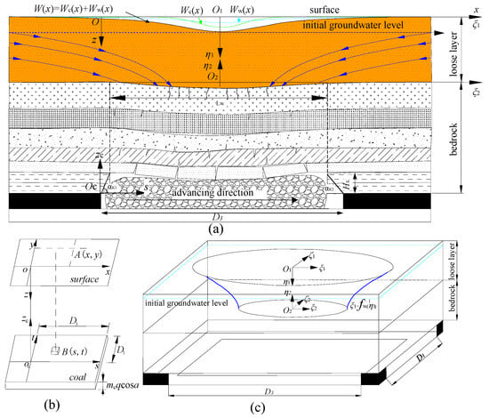 (a) A surface subsidence model considering both the effects in a two-dimensional condition. The black subsidence curve W (x) is the model considering both the effects. The green subsidence curve Wc (x) is the model considering the single effect of coal mining. The cyan subsidence curve Ww (x) is the model considering the single effect of loose layer drainage. The blue curves with blue arrows represent the groundwater level decline direction; (b) three-dimensional coordinate system of PIM; (c) loose layer drainage region in the three-dimensional coordinate system.