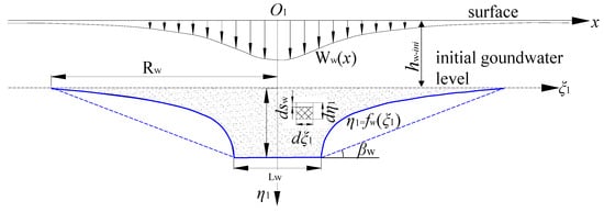 In Figure 2, η1 = fw(ξ1) is the characteristic curve of the groundwater level decline due to loose layer drainage. It can be represented as a combination of two curves and a straight line as follows: f1w (−Rw ≤ ξ1 ≤ −Lw/2), f2w (−Lw/2 < ξ1 < Lw/2), f3w (Lw/2 ≤ ξ1 ≤ Rw). The expression of fw(ξ1) is: