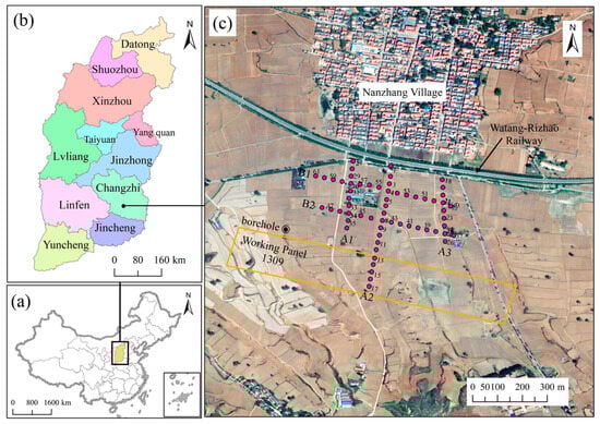 (a) Map of China; (b) map of Shanxi province; (c) the geographic location of working panel 1309. The magenta-circle dots represent the observation points used for leveling. The orange polygon represents the working panel 1309.
