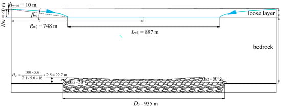 where D3 is the mining length, (m). Hk is the height of the caved rock which can be calculated in Equation (A13), (m). αK1 and αK2 are caved angles, (°). The parameters D3, Hk, αK1, and αK2 are shown in Figure 1a.