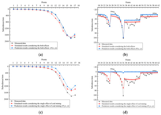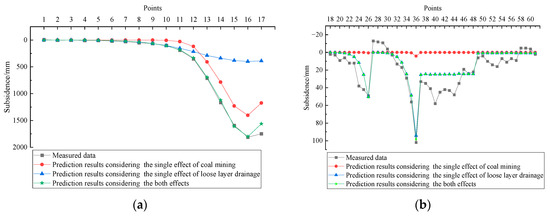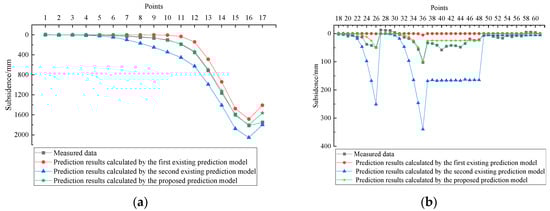 Comparison between the measured data and the prediction values: (a) comparison of subsidence results from Points No. 1 to No. 17; (b) comparison of subsidence results from Points No. 18 to No. 61. Positive values represent subsidence, while negative values represent uplift.