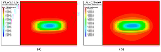 The surface subsidence prediction results obtained by substituting the values of the aforementioned parameters into the model proposed in this paper (equations from Equations (A1)–(A3) and Equation (4)) are shown in Figure 7. For the triple integral in Equation (4)), code was written and combined with numerical integration functions in MATLAB software (version R2022b) to perform calculations [40].