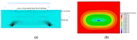 Mining-induced disturbances alter the hydraulic properties of aquifers during the process of groundwater level decline. Significant groundwater loss due to coal mining produces a localized drop in the water head around the mined-out area, forming a funnel-shaped depression [12,13]. The loose layer drainage can thus be regarded as a process of large-scale groundwater extraction, akin to a massive pumping well [14]. Conventionally, the groundwater depression cone generated by pumping is understood as a “funnel-shaped zone of water head decline” [15,16]. In recent years, researchers have explored the patterns of groundwater level changes under the mining-induced disturbance. In terms of practical measurements, Chambers et al. (2015) [17] proposed the use of automated time-lapse electrical resistivity tomography to monitor groundwater. Field observations have revealed that images of resistivity changes and direct current conductivity (DGC) results are highly useful for determining pre-rebound groundwater levels, which closely match the groundwater levels in observation wells. Additionally, they can identify peak groundwater levels that are in good agreement with surface observations. In terms of simulation studies, Li conducted similar material simulation experiments considering two scenarios: coal mining advancing perpendicular to, and parallel with, the direction of groundwater flow. By analyzing the data on water level changes, he used Surfer (version 12) software to visually reconstruct the changes in groundwater decline and the influence boundary under the mining condition. As the working panel advances further, the influence radius and the decline depth of groundwater increase, with the degree of groundwater level decline being inversely proportional to the distance from the working panel [18]. Loupasakis, through a literature review, found that subsidence funnels caused by dewatering under the influence of opencast mining can extend for several kilometers. He used PLAXIS 2D (version 8) finite element simulation to explain the mechanisms considering different deformations and surface cracks within the subsidence funnel area [11]. Khan applied the visual MODFLOW (version 2011.1) model to groundwater level data, revealing that coal mining has impacted the groundwater resources, with groundwater levels declining at a rate of 0.142 m per year [19]. Pan established a groundwater flow system model for abandoned mine areas and used the MODFLOW calculation module in GMS (Groundwater Model System, version 7.0) to study the regional groundwater flow field. The study found that before the coal mine was closed, several funnels formed in the mining area, with central water levels below −25 m. After the mine was closed, the original drainage systems ceased operation, leading to a gradual recovery of groundwater levels and a reduction in the funnels. The rate of groundwater level recovery slowed as the time since mine closure increased [13]. Although these studies provide valuable insights into groundwater level variation under mining disturbances, the quantitative description of the spatial distribution of groundwater levels remains inadequate. To further analyze the quantitative relationship between groundwater level changes and soil deformation, it is necessary to determine the spatial distribution of groundwater level within the loose layer under the mining disturbance. This will pave the way for the accurate prediction of surface subsidence.