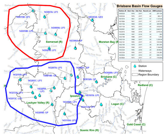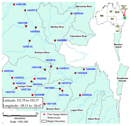 This study focuses on the Brisbane River basin in Queensland, Australia—a region highly prone to flooding. Located in southeast Queensland, the catchment spans from the Great Dividing Range upstream to Moreton Bay downstream, covering 13,570 km2 (mostly rural) and including the Brisbane River, Lockyer Creek, and Bremer River [27]. Streamflow data from gauges (Figure 1) with records of at least 20 years were analyzed, including some with over 90 years of observed AMF data. Most records are post-1960, with daily and annual maximum flow series, sourced from Queensland’s Department of Natural Resources and Mines.