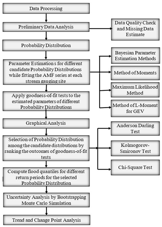 The overall approach adopted in this study (Figure 2) consists of (i) selection of candidate probability distributions, (ii) selection of suitable parameter estimation methods, (iii) goodness-of-fit (GoF tests) to select suitable probability distributions, (iv) flood quantile estimation and sensitivity analysis, and (v) trend detection using parametric and non-parametric tests.