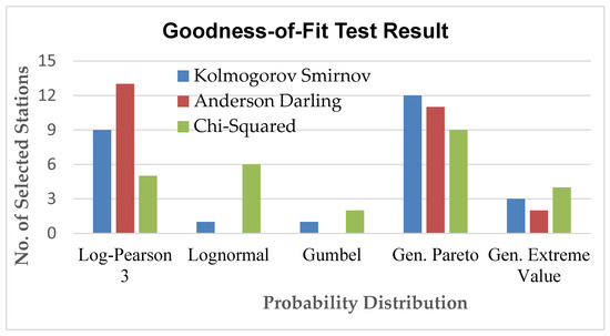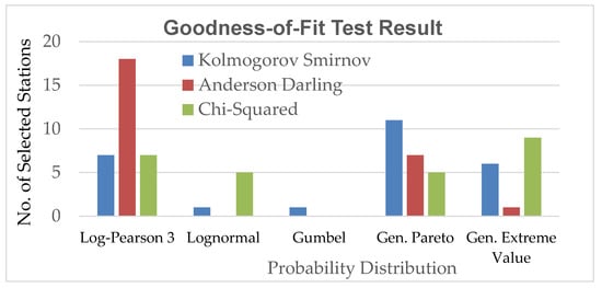 FFA results may be changed if the highest flood record from the AMF data series is ignored. To investigate the sensitivity of the selection of the best-fit probability distribution and quantile estimation, FFA was carried out by removing the highest flood record from the AMF data series at a station, and by removing the two and three highest flood records. Figure 7 shows the best-fit distribution with three different GoF tests without the highest flood event from each of the 26 stations’ AMF data.