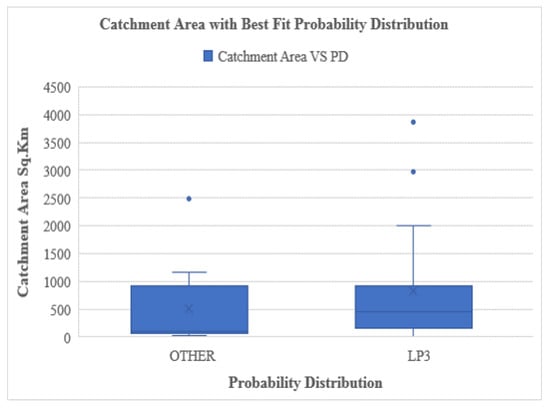 Figure 4 illustrates the spatial distribution of best-fit probability distributions based on the A-D test. LP3 is predominantly the best-fit probability distribution in the upper, mountainous regions of the basin, while GP is more common downstream. Overall, LP3 dominates most of the Brisbane River basin, highlighting its suitability across varied terrain within a large river basin. It is seen from the box plot of the catchment area and the best-fit distribution (Figure 5) of the selected stations that there is a weak relationship between catchment area and the best-fit probability distribution, although larger catchments tend to follow the LP3 distribution, as indicated by the higher third quartile value and the high outliers in Figure 5 (right boxplot representing catchment areas associated with the LP3 distribution).