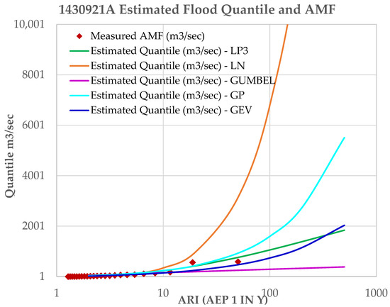 FLIKE-generated probability plots display estimated quantile lines from candidate distributions, the AMF data, and the confidence limit. The Y-axis of the FLIKE probability plot is the estimated quantile and the observed AMF, and the x-axis is an annual exceedance probability (AEP) of 1 in Y. FLIKE-estimated quantile plots for all five probability distributions of Station 143015B are shown in Figure 6. FLIKE-estimated quantiles for the other stations are provided in the Supplementary Section (Figures S1–S25). Figure 6 shows that for Station 143015B, the LP3 distribution provides the best fit for flood quantile estimation, supported by the A-D GoF test. While the results from EasyFit and FLIKE differ slightly, both indicate LP3 as the most suitable distribution for this station. This aligns with the previous studies of Rahman et al. [5], who identified LP3 to be the most appropriate distribution for at-site FFA across Australia. The LP3 was also recommended in the ARR [42], though the later edition [2] does not specify a preferred probability distribution. Similarly, Zaman et al. [44] recommended LP3 and GEV as the best-fit distributions for most Australian stations.
