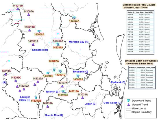 We evaluated trends and abrupt changes in AMF data for all 26 stations using 12 statistical tests at the 1%, 5%, and 10% significance levels (Table 10 presents the results for a station). A summary of the trend analysis tests for all selected stations is shown in Table 11, where some test statistics show upward (positive) or downward (negative) trends in the AMF data. The presence of a step jump in the data between two subsets of data within the data series is evaluated using the distribution-free CUSUM test, cumulative deviation test, and Worsley Likelihood Ratio test. The summary result (Table 11) shows that a limited number of stations’ AMF data have a step jump at the 10% significance level. It is seen in Table 11 that 21 stations’ AMF data have a mild positive slope in their linear regression line and 5 stations’ data have a negative slope. Figure 8 presents a layout map with statistically significant trends in the AMF data at the 10% significance level for all the stations. Most of the 12 statistical trend tests detected no significant trend in the AMF series across the 26 stations (Table 11). Only Station 143015B (Cooyar Creek, 953 km2) shows a trend at the 10% significance level in the MK and Spearman’s Rho tests. This upstream catchment is largely unaffected by human activity, and its highest AMF (853 m3/s) occurred in 2011.