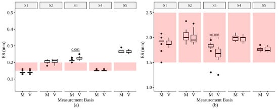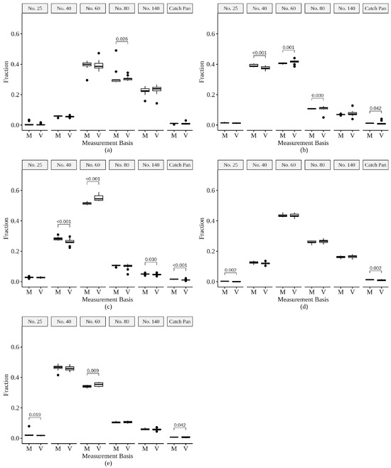 Mann–Whitney results and the fraction of a sample retained on a laboratory sieve using sand mass (M) or sand volume (V) measurements for (a) S1; (b) S2; (c) S3; (d) S4; and (e) S5. The numbers above brackets indicate the Mann–Whitney p-values for statistically different comparisons.