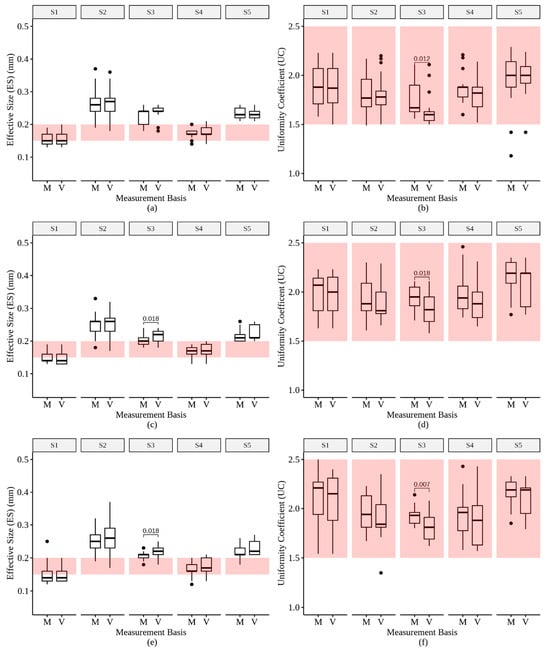 Boxplots for (a) effective size (ES) using CAWST PSD (n = 17); (b) uniformity coefficient (UC) using CAWST PSD (n = 17); (c) ES using CAWST App (n = 17); (d) UC using CAWST App (n = 17); and (e) ES using CAWST Graph (n = 17); and (f) UC using CAWST Graph (n = 17) based on sand mass (M) versus sand volume (V) measurements. Red highlights represent the suggested ES and UC ranges by CAWST. Numbers above brackets indicate the Mann–Whitney p-values for statistically different comparisons.