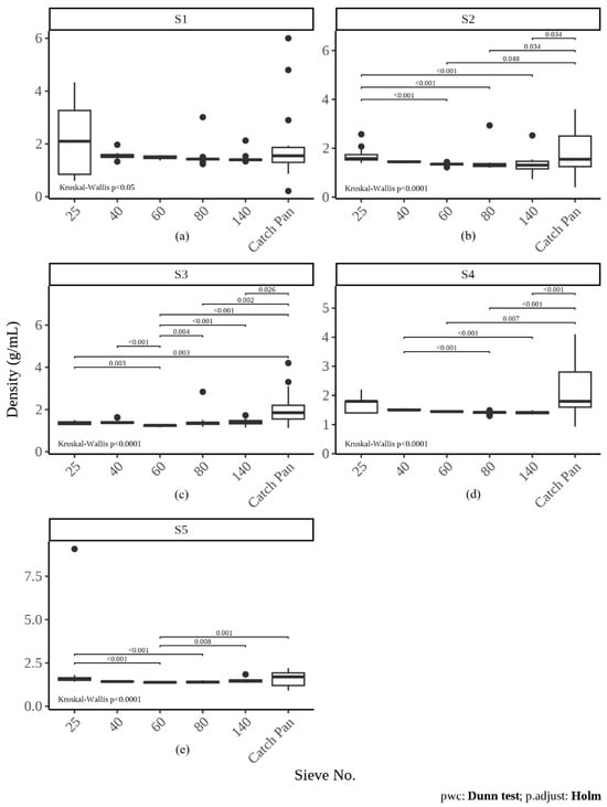Densities of the sand samples retained on each sieve for (a) S1; (b) S2; (c) S3; (d) S4; and (e) S5. Boxplots were determined using laboratory sieves, and densities were calculated using the mass and volume retained on each sieve after the sieving process. Numbers above brackets indicate Holm-adjusted, post hoc Dunn Test values for statistically different comparisons.