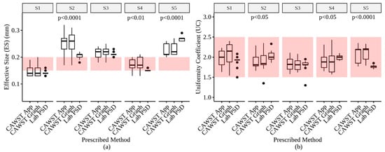 Comparison of effective size (ES) values (n = 17; (a)) and uniformity coefficient (UC) values (n = 17; (b)) for the three prescribed methods. Red highlights represent the suggested ES and UC ranges by CAWST. Kruskal-Wallis p-values are shown for ES and UC values that significantly differ across the three prescribed methods for a sand sample.