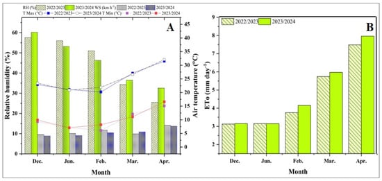 Seasonal variation in meteorological parameters and reference evapotranspiration (ETo) during the 2022/23 and 2023/24 winter growing seasons in Assiut, Egypt: (A) monthly averages of maximum/minimum air temperature (lines), relative humidity (RH), and wind speed (WS) (bars); (B) monthly reference evapotranspiration (ETo, mm day−1).