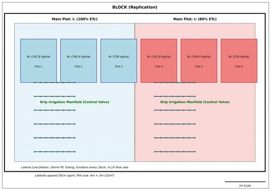 The experiment used a split-plot layout within a randomized complete block design (RCBD) and was replicated three times (Figure 2). The main plots were divided into two irrigation treatments: I1 (100% ETc) and I2 (80% ETc). Subplots at each irrigation level received varied nitrogen rates: N1 (142.8 kg N ha−1), N2 (190.4 kg N ha−1), and N3 (238.0 kg N ha−1). Six treatments were obtained for each experiment by combining three nitrogen rates of application with two irrigation levels. The study involved 18 plots, each measuring 12.0 m2 (4 m × 3 m) and containing eight ridges. Plots were spaced 1 m apart, with a 1.5 m gap between blocks. The drip irrigation system made use of 16 mm GR polyethylene tubing with integrated emitters that were spaced by 30 cm. With lateral lines spaced 50 cm apart, water was delivered at a rate of 4 L h−1 per emitter at a pressure of 1.5 bars.