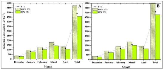 Monthly irrigation applied (bare) and crop evapotranspiration (ETc) (line) during the two winter growing seasons: 2022/23 (A) and 2023/24 (B).