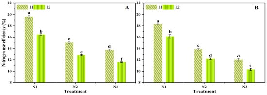 Effect of irrigation levels and nitrogen rates on nitrogen use efficiency (NUE) during two winter seasons: (A) 2022/23 and (B) 2023/24. Data are presented as means; line bars indicate ± standard errors. Within each column, different letters indicate significant differences (p < 0.05).