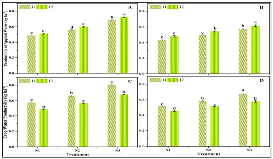 Effect of irrigation levels and nitrogen rates on productivity of applied water (PAW) and crop water productivity (CWP) for two winter seasons: (A,C) 2022/23 and (B,D) 2023/24. Data are presented as means; line bars indicate ± standard errors. Within each column, different letters indicate significant differences (p < 0.05).