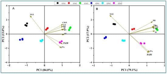 Principal component analysis (PCA) of the effects of irrigation water levels and nitrogen application rates on major plant growth: yield attributes during the first season (2022/23) (A), and the second season (2023/24) (B).