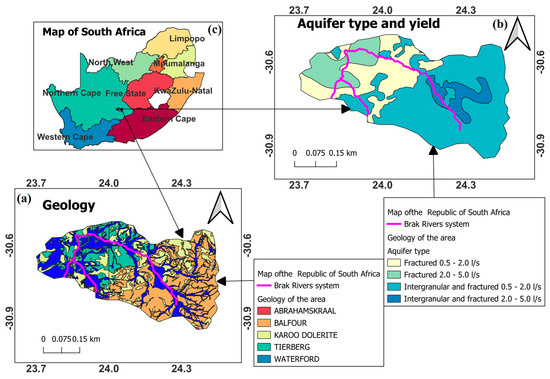 (a) Surface geology represented by Tierberg and Middleton’s formation, which is composed of shale, sandstone, mudstone, and siltstone, as well as Quaternary sediment of calcrete, sand, silt, clay, and gravel. (b,c) Aquifer characteristics and the associated yields with specific reference to the De Aar, Northern Cape Province, South Africa.