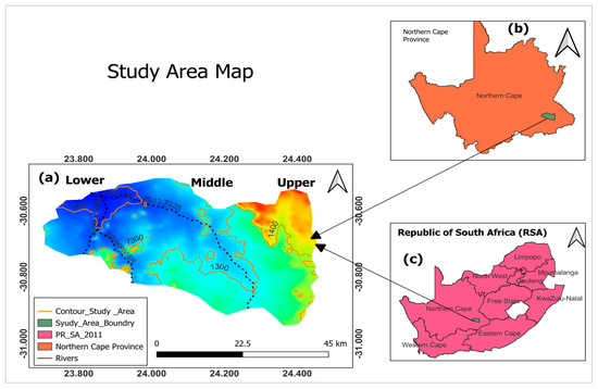 (a) The location of the study area with physiographic environmental features like Brak River systems (dashed line), contours (orarage solid lines), and elevations (various colour coding). (b,c) show the study area location with specific reference to the De Aar region, Northern Cape Province, South Africa.