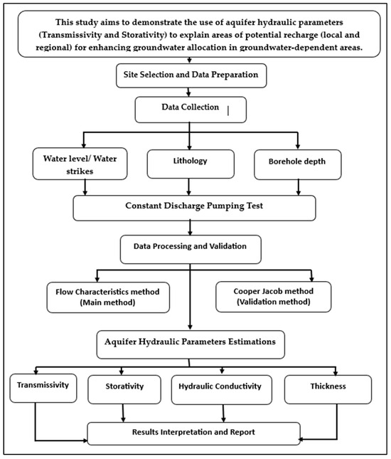 where Re represents the recharge component [6]. The reserve is subtracted from the recharge (Re), and the remainder is allocated to the users. This conventional approach for allocating groundwater presents a challenging scenario, as it remains uncertain whether the recharge applied in the current practice for groundwater allocation represents local or regional recharge. Therefore, to enhance understanding of groundwater allocation, recharge must consider the type and spatiotemporal scale variability it represents. However, the major limitation of the current approach is that recharge does not account for the type and extent of the aquifer in terms of local and regional scale variability; instead, it assumes that recharge is uniformly distributed across the catchment. This problem can be resolved by using aquifer hydraulic properties from a wide range of available methods and justified by developing a simplified regional hydrogeological conceptual model [7]. According to Walvoord et al. [8], a conceptual model is a visual representation of the groundwater flow system, frequently in the form of a cross-section or block diagram. It is developed based on geological, geophysical, hydrological, and hydrogeochemical information [9]. The properties of each unit’s hydraulic parameters, the locations of the phreatic and piezometric surfaces, and the groundwater flow conditions are also included in conceptual models. Betancur et al. [10] demonstrated that integrating multiple methods, such as data analysis, modelling, geochemical studies, and risk evaluation, can produce a reliable hydrogeological conceptual model. Applied in Colombia’s Bajo Cauca region, this approach revealed a three-unit aquifer system with multiple recharge sources and contamination risks from human activities [10]. The model was validated and proved effective for groundwater management. Rojas et al. [2] evaluated conceptual model uncertainty for the Pampa del Tamarugal aquifer in Northern Chile using a multi-model ensemble of eight alternatives. They emphasized that accounting for model uncertainty is crucial for sustainable groundwater management, especially under high demand and climate variability. Their study also highlighted the need for diverse models, better data, and refined model probabilities to improve reliability. Karlović et al. [9] developed a validated hydrogeological conceptual model of an alluvial aquifer in De Aar, South Africa, using diverse environmental data. Featuring a three-layer structure and recharge estimates from the WetSpass-M model, it supports future groundwater flow modeling and resource management. Baloyi et al. [11] identified a multi-layer aquifer system in De Aar, South Africa, with varying groundwater potential. Borehole data revealed fully penetrating wells through unconfined and semi-confined layers, indicating a double-layer aquifer structure. High-yield boreholes (over 5 L/s) are typically found in weathered, fractured contact zones between dolerite intrusions and shale beneath alluvium, especially in areas with total calcification. Estimation of aquifer hydraulic properties for understanding the hydrogeologic processes is a basic prerequisite for sustainable allocation of groundwater resources [12]. This is particularly important because sustainable water allocation, as framed by the 2030 Agenda and sustainable development goal 6 (SDG), is about equitable, efficient, and resilient distribution of water resources, ensuring that all people, ecosystems, and sectors have access to water now and in the future, while balancing the complex social, economic, and environmental demands of a changing world [13]. Therefore, by accurately estimating aquifer hydraulic parameters and integrating local and regional recharge into planning for groundwater allocation, groundwater practitioners and managers can sustainably manage groundwater and enhance understanding of recharge potential areas and resilience, thereby achieving Sustainable Development Goal 6, particularly in areas relying heavily on groundwater.