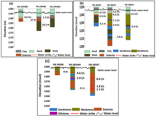 The unconfined and confined layers, which are connected both vertically and horizontally, make up the aquifer system in this study [11]. Sand, clay, silt, and gravel make up the weathered alluvium formation that forms the unconfined aquifer system. The bedrock unit of the confined aquifer system consists of sandstone, mudstone, shale, and dolerite in an alternating order. Monitoring boreholes reveal that the depth to the static water level ranges from 3.3 to 4.7 m. High elevation regions typically constitute the majority of the aquifers’ local and regional recharge areas. High-yielding groundwater strikes are frequently found in the upper and lower contact zones between sandstone and dolerite, or shale and dolerite, although dolerite intrusive formations are not particularly productive for groundwater [23]. Compared to the underlying dolerite portions, the water strike in the sedimentary layers above the dolerite is noticeably larger. The fractured sandstone beneath the alluvium formation in these zones has boreholes that yield more than 5 L/s, especially in areas where almost total calcification has taken place (Figure 1b) [18]. Vegter classifies the groundwater quality in the study area as class II because the total dissolved solids (TDS) are more than 1000 mg/L, and the electrical conductivity (EC) is between 150 and 250 mS/m [23]. In terms of water supply, the aquifer is the sole source of water available to users. This means that the aquifer represents the only available source of groundwater allocation derived solely from the aquifer units. Shallow and deep boreholes that penetrate both confined and unconfined aquifers, representing the entire aquifer system, abstract groundwater for the community’s water supply. Excessive pumping causes water level changes that have a significant impact on this aquifer.