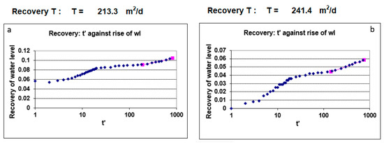 The straight line fitted to recovery data for estimating transmissivity from the observation boreholes in the lower catchment site. (a,b) show the late-time recovery response where transmissivity is estimated, where the aquifer system has moved past early transient effects.
