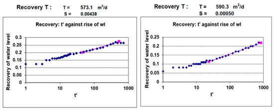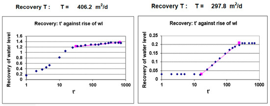 where T is the transmissivity (m2/day); S is the storativity; s is the drawdown (m); t0 (min) is a sufficiently late time during the hydraulic test, and r (m) is the distance from the pumping borehole, where s is measured in the observation borehole or piezometer [26]. Transmissivity as T is related to hydraulic conductivity K (m/day) through aquifer thickness b (m), as shown in Equation (2):