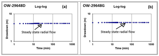 Steady-state flow condition identified using drawdown data from two observation boreholes in the lower catchment site, with horizontal line in borehole OW-29648D (a) and OW-29648G (b) illustrates stability of the drawdown, indicating no further change with time.