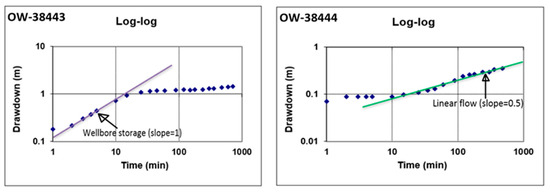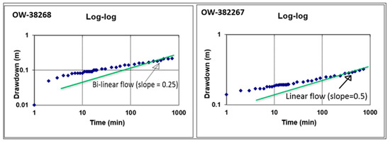 Borehole OW-38268 illustrates fitted bi-linear flow transitioning from the fracture to the matrix flow condition, while OW-382267 illustrates the linear flow dominant from one or two directions.