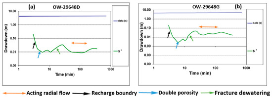 Shows the derivative plot of the flow regimes during the test, i.e, recharge boundary, double porosity, fracture dewatering, and acting radial flow from observation borehole OW-29648D (a) and OW-29648G (b) in the lower catchment.