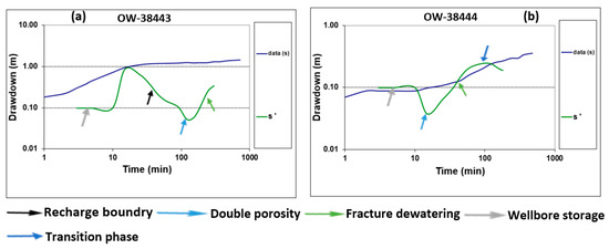 Shows the derivative plot of the flow regimes during the test, i.e, recharge boundary, double porosity, fracture dewatering, wellbore storage and transition phase in the middle catchment from observation borehole OW-38443 (a) and OW-38444 (b) in the middle catchment.