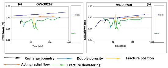 Shows the derivative plot of the flow regimes during the test, i.e, recharge boundary, double porosity, fracture position, acting radial flow, and fracture dewatering in the upper catchment from observation borehole OW-38267 (a) and OW-38268 (b) in the upper catchment.